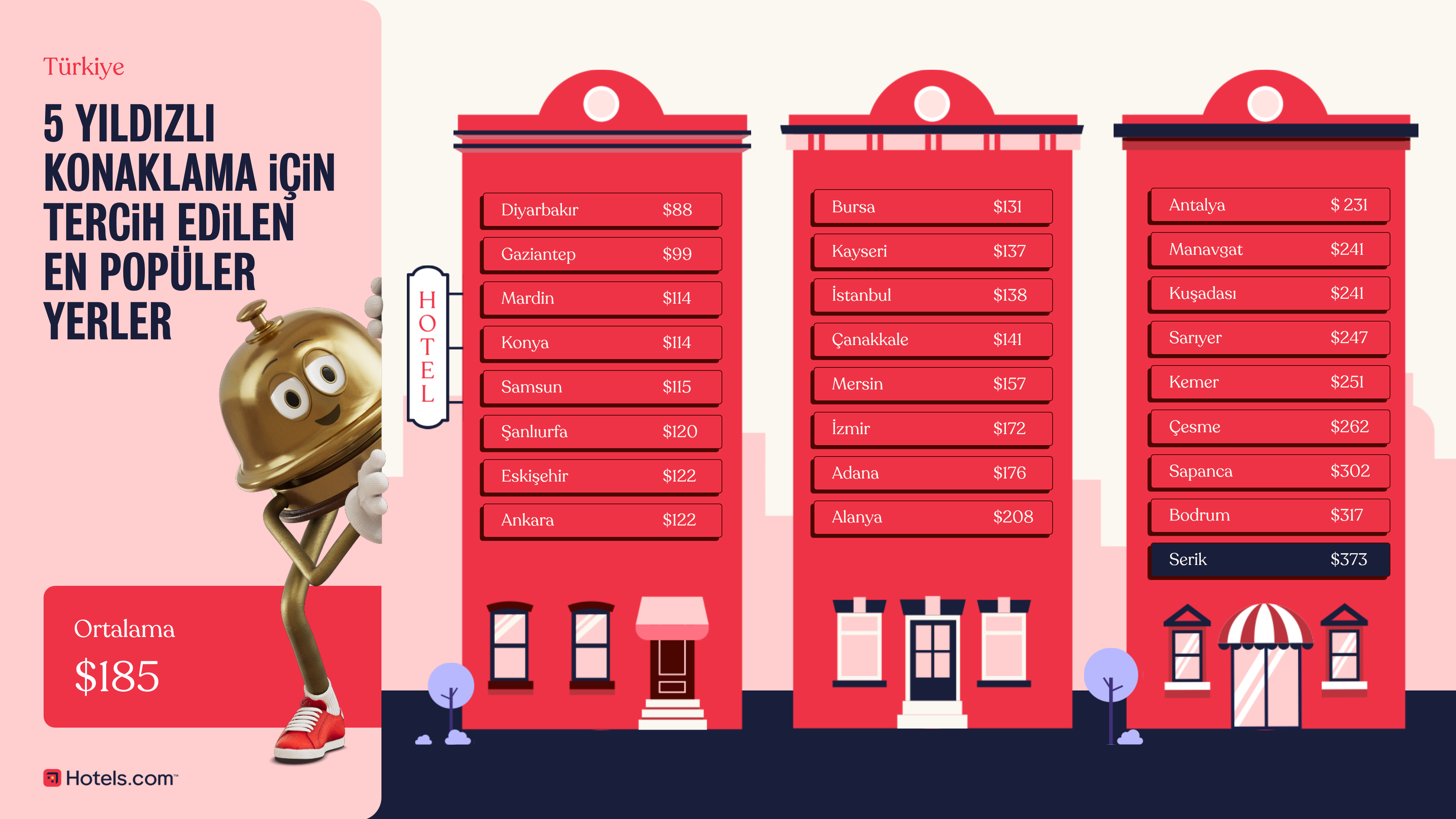 - Yurt içi lüks seçenekler yurt dışına göre tasarruf sağlıyor: Türkiye'nin en popüler destinasyonlarındaki 5 yıldızlı oteller, yurt dışındaki alternatiflerine kıyasla ortalama %29 daha uygun fiyatlı. İstanbul, İzmir, Çanakkale ve Adana gibi şehirlerde ise 200 doların altında dikkat çekici 5 yıldızlı fırsatlar bulunabiliyor.