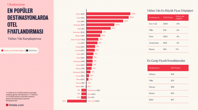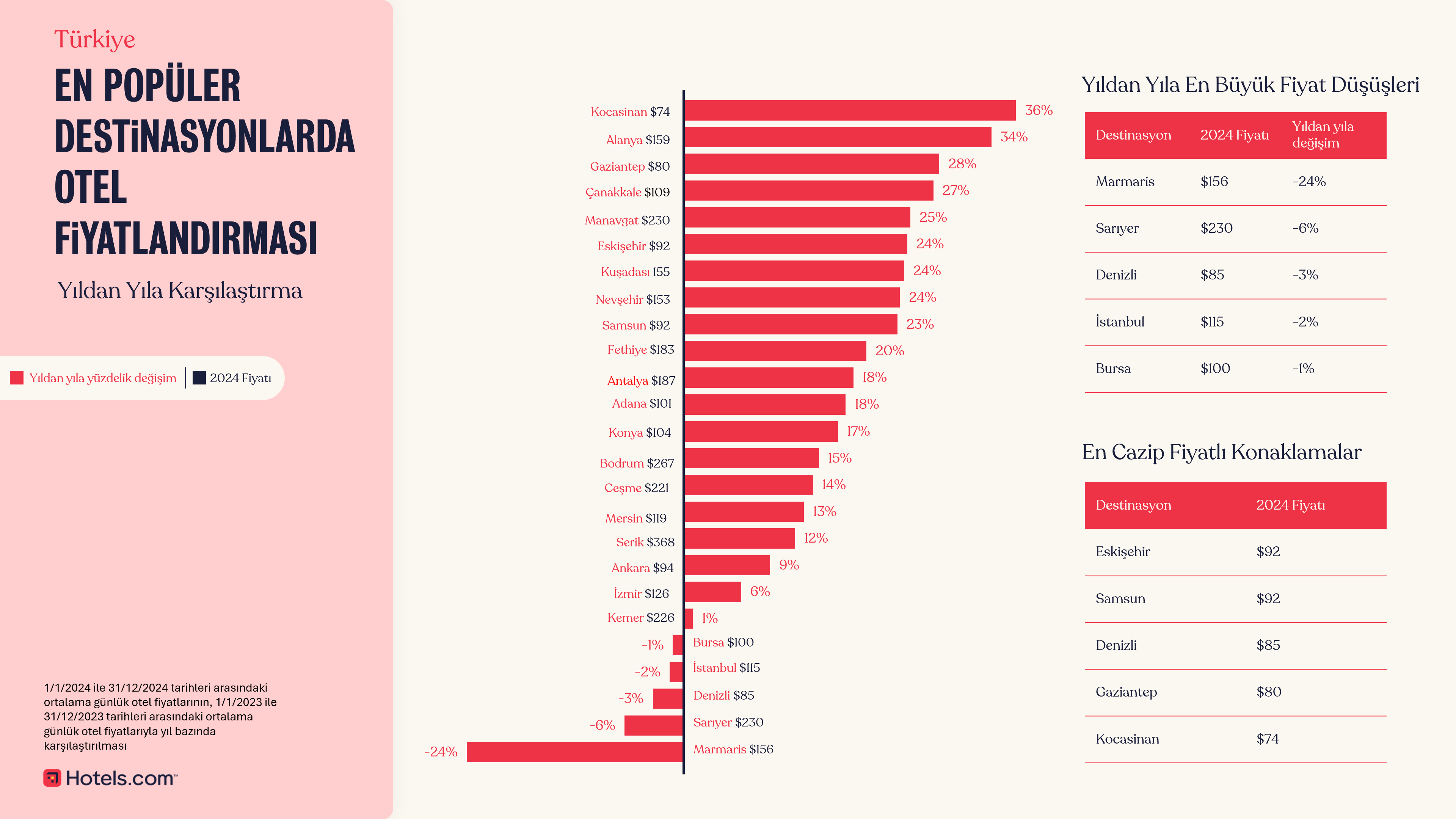 - Marmaris (-%24), Denizli (-%3), İstanbul (-%2) ve Bursa (-%1) dahil olmak üzere bazı Türk destinasyonlarında otel fiyatlarında düşüşler görüldü.Buna karşın Kocasinan (%36) ve Alanya (%34) ilçeleri ise otel fiyatlarındaki artışa öncülük etti.
