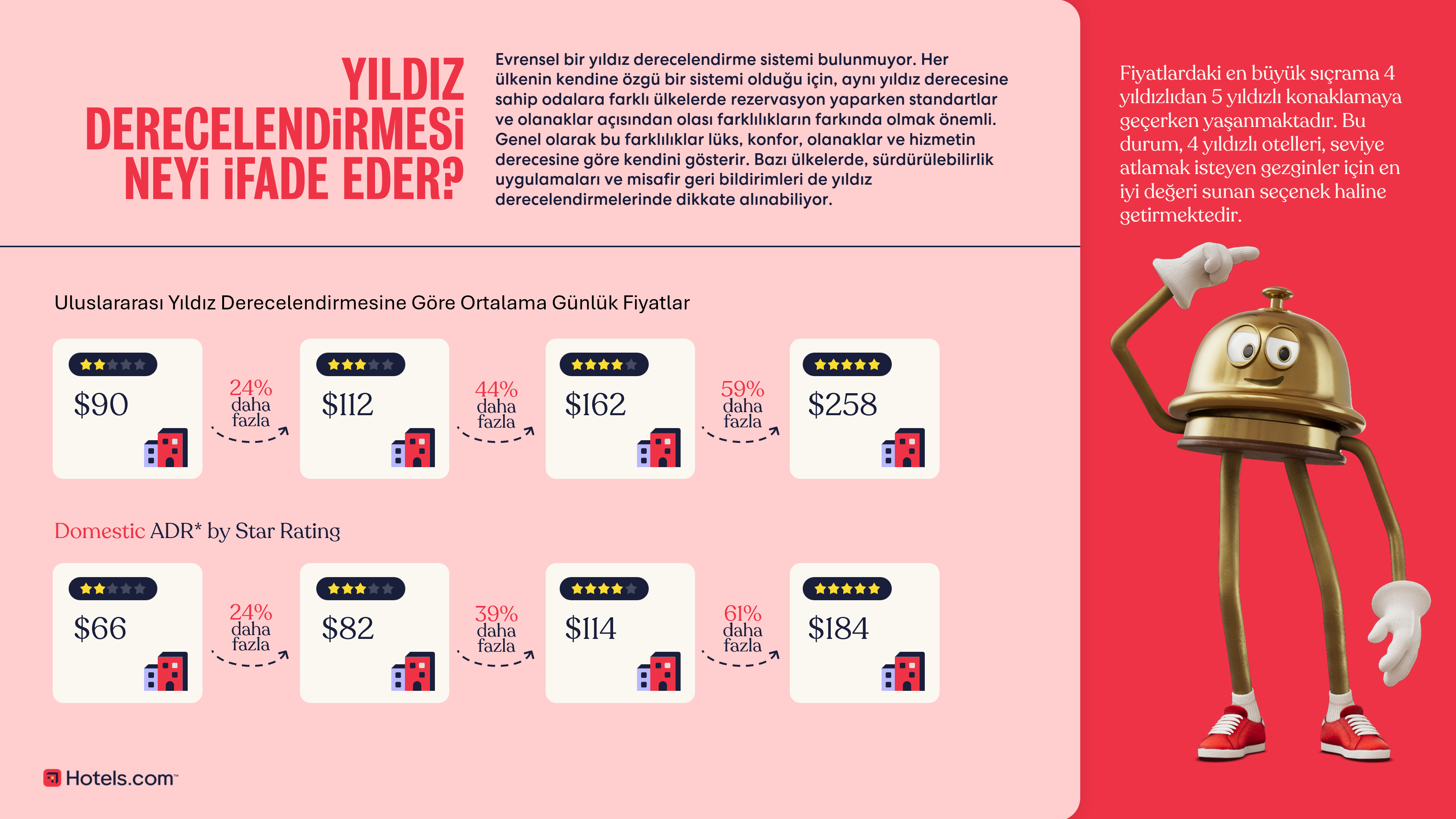 Hotels.com'un raporuna göre, yurt içi konaklamalarını bir üst yıldıza taşımak isteyen gezginler için 4 yıldızlı oteller en iyi seçenekleri sunuyor; ortalama günlük fiyatları 3 yıldızlı tesislere göre %39 daha yüksekken, 5 yıldızlı oteller 4 yıldızlı otellere göre ortalama %61 daha pahalı.