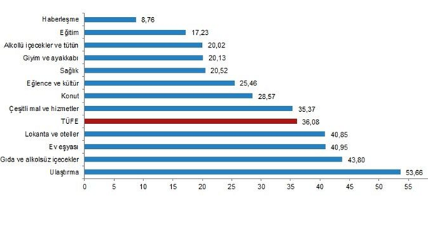 Yıllık en düşük artış % 8,76 ile haberleşme ana grubunda gerçekleşti. Bir önceki yılın aynı ayına göre artışın düşük olduğu diğer ana gruplar sırasıyla %17,23 ile eğitim, %20,02 ile alkollü içecekler, %20,13 ile giyim ve ayakkabı oldu.Buna karşılık, bir önceki yılın aynı ayına göre artışın yüksek olduğu ana gruplar ise sırasıyla, %53,66 ile ulaştırma, %43,80 ile gıda ve alkolsüz içecekler, %40,95 ile ev eşyası oldu.Lokanta ve otellerde ise fiyat artışı % 40,85 oldu.