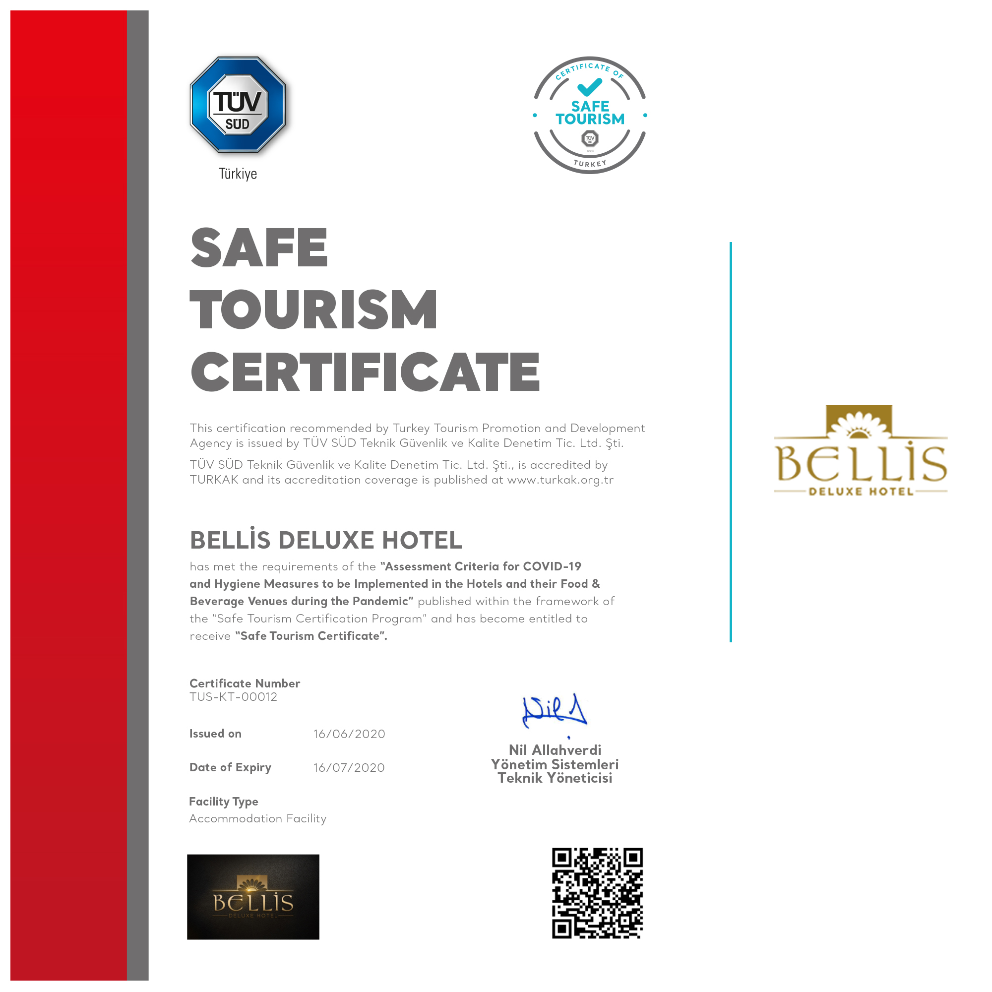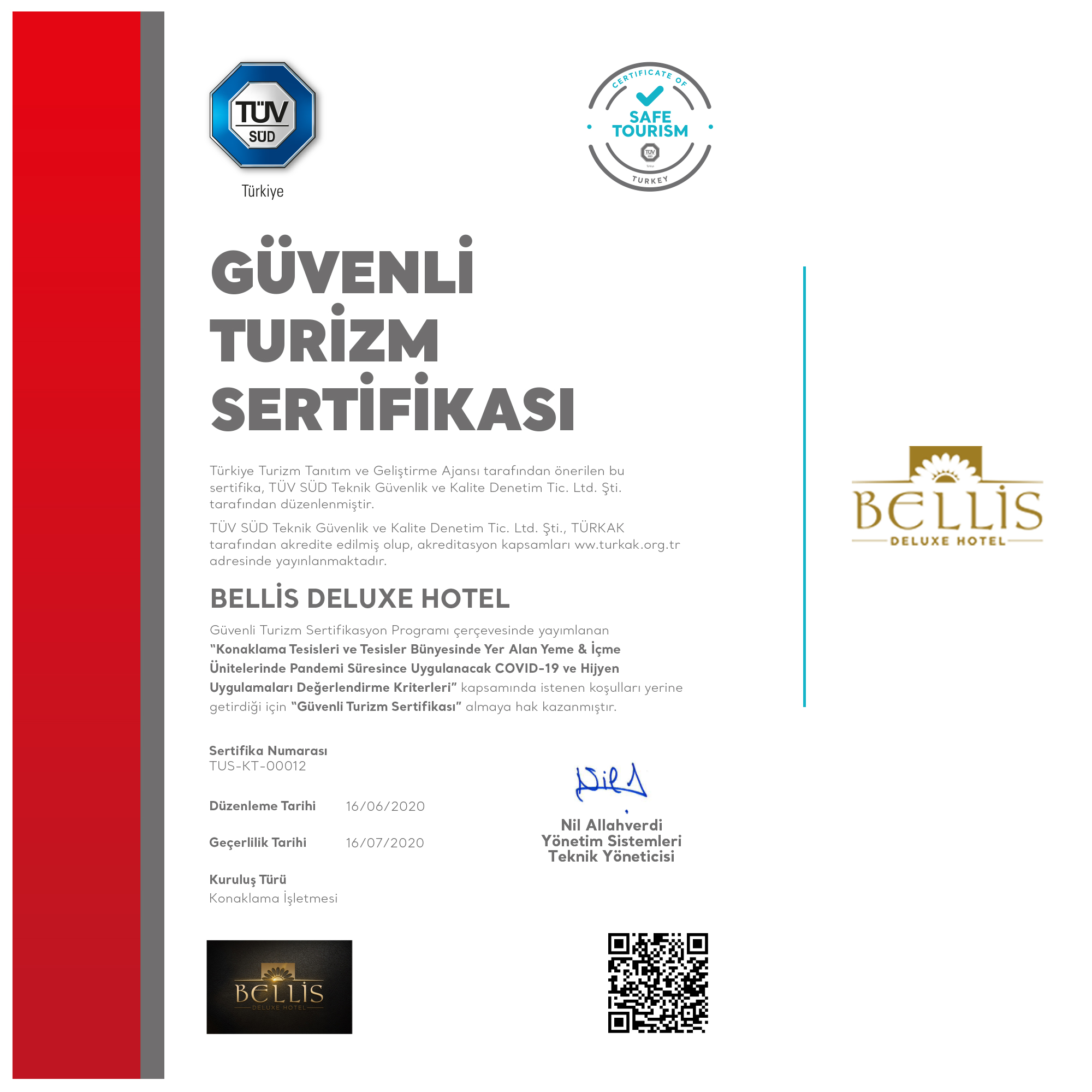 Türkiye’nin en iyi tatil otelleri arasında gösterilen Bellis Deluxe Resort Hotel Güvenli Turizm Sertifikası alarak güvenle tatil yapılabilecek sağlıklı oteller arasına girdi.