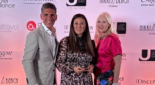 Ödülü Çırağan Palace Kempinski İstanbul Pazarlama ve Halkla İlişkiler Direktörü Neslihan Şen, Kempinski Hotels Ticari İşler Direktörü ve Yönetim Kurulu Üyesi Amanda Elder ve Kempinski Hotels EMEA Operasyon Direktörü ve Yönetim Kurulu Üyesi Timur Sentuerk Dubai'deki gala töreninde birlikte kabül ettiler.