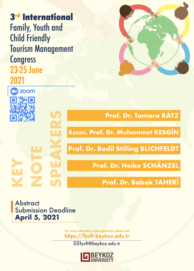 3. Uluslararası Aile, Gençlik ve Çocuk Dostu Turizm İşletmeciliği Kongresi’ne başta akademisyenler olmak üzere, turizm, işletme ve ekonomi alanlarındaki teorisyen önderleri ve uygulamacıları katılacak. Kongrenin açılış konuşmaları; Prof. Dr. Tamara Rátz, Prof. Dr. Bodil Stilling Blichfeldt, Prof. Dr. Heike Schänzel, Prof. Dr. Babak Taheri ve Doç. Dr. Muhammet Kesgin tarafından yapılacak. Konuşmaların konuları; “Çocukların Tatil Yerleri ile İlgili Algıları”, “Aile Tatilleri: Etkin Tüketici Tatil Tasarımı”, “Çocuk Dostu Tatiller; Aile ile Geçirilen Zamanın Miktarı ve Niteliği”, “Sürdürülebilirlik, Üretkenlik ve Yeni Mutlu/Mutsuz Turizm” ve “Covid-19 zamanında Aile-Turizmi ile Sosyal İletişimi ve Etkileşim ve Birliktelik” olarak belirlendi. Ayrıca; ‘yönetim ve organizasyon, stratejik yönetim, pazarlama, çocuk dostu otellerde beslenme, turizm sektöründe gençler ile iletişim, aile turizmi, insan hakları ve turizm’ gibi birbiri ile ilişki pek çok başlık kongrede ele alınacak. Bu sayede kongrenin alanı biraz daha genişleyerek, aile ve gençlik turizmi konularına farklı disiplinlerden de katkı sağlanacak. Kongrede sunulan tebliğlerden bazıları, tebliğ sahibi akademisyenlerin istekleri ve hakemlerin uygun bulması halinde, ULAKBİM TR dizin alan endeksi veri tabanında taranan hakemli Beykoz Akademi Dergisi’nin özel sayısında da yayınlanabilecek.