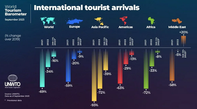 Gelen gezgin sayısının 2019'a kıyasla %20 oranında Kovid öncesi seviyeleri aştığı tek bölge Orta Doğu oldu.