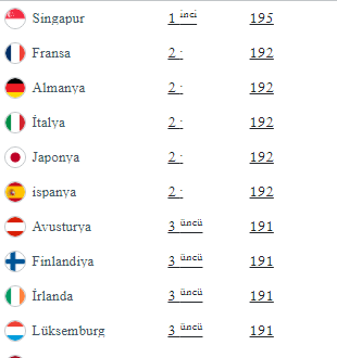 Henley & Partners'ın Pasaport Endeksi Uluslararası Hava Taşımacılığı Birliği (IATA) verilerine dayanarak ülkelerin vatandaşlarının vizesiz ziyaret edebileceği destinasyon sayısına göre sıralama yapıyor.