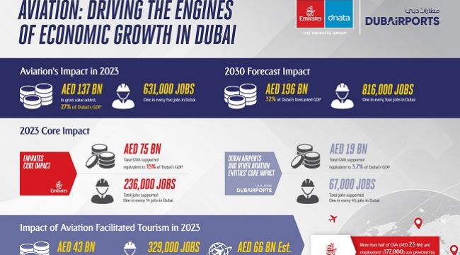 Toplamda, havacılığın kolaylaştırdığı turizm harcamalarının brüt katma değer olarak 43 milyar AED veya Dubai'nin GSYİH'sinin %8,5'ine katkıda bulunduğu ve 329.000 istihdamı desteklediği tahmin ediliyor. GVA'nın yarısından fazlası olan 23 milyar AED, Emirates ile Dubai'ye uçan yolculardan elde edildi. Dubai'ye yönelik turizmin önümüzdeki altı yıl içinde önemli ölçüde büyümesi ve havacılık destekli turizm harcamalarının, Dubai'nin öngörülen GSYİH'sinin %10'una ve Dubai'deki her sekiz işten birine denk gelen 63 milyar AED’lik GVA tutarında desteklemesi bekleniyor.