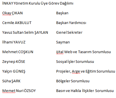 İNKAY’ ın 27.01.2019 tarihinde yapılan seçimli olağan genel kurulunda başkanlığa Okay ÇIKAN getirilirken yönetim kurulunda yeni görev dağılımı ise şöyle gerçekleşti.