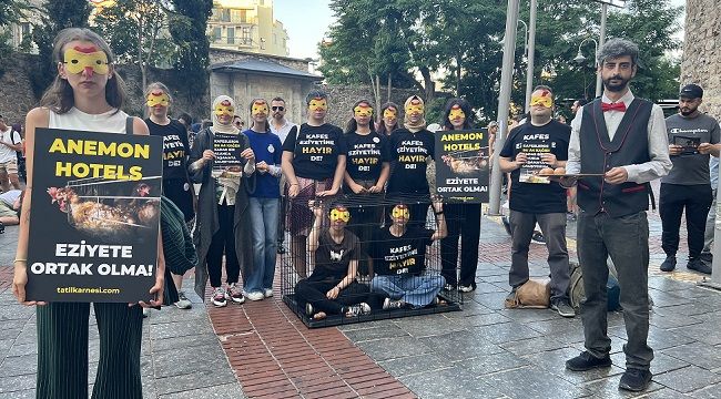 Yumurtası için yetiştirilen tavukların hapsedildiği zalim ve çağdışı kafes sisteminin ortadan kaldırılması için çalışan Kafessiz Türkiye kampanyası, hâlâ kafes yumurtasını terk edeceğini açıklamayan Anemon Hotels’in Galata şubesi önünde eylem yaptı.