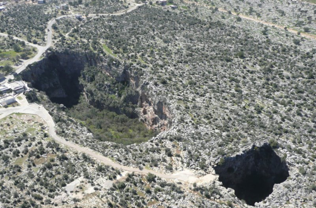 Bir yeraltı deresinin yol açtığı kimyasal erozyonla tavanın çökmesi sonucu meydana gelmiş büyük bir çukurdur. Cennet çöküğünün içine her biri geniş 452 basamaklı taş bir merdivenle inilir. Kiliseye üç yüzüncü basamakta varılır. Kiliseden sonraki mağaranın bitim noktasında bir yeraltı nehrinin sesi duyulabilir.Mitolojiye göre; Zeus, alevler kusan yüz başlı ejderha Typhon'u buradaki bir kavgada yendikten sonra, onu sonsuza dek kapatmadan önce bir süre Cehennem çukurunda hapseder.