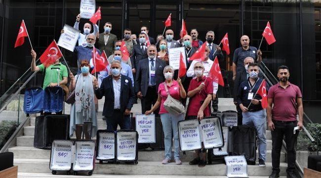 Seyahat Acenteleri sahipleri, pandemiden kaynaklanan talep ve sorunlarını duyurmak amacıyla bir araya geldi. Acente sahipleri “Bacasız sanayi turizmde yangın var” diyerek boş valizleri ve cüzdanları göstererek hükümetten yardım talebinde bulundu.