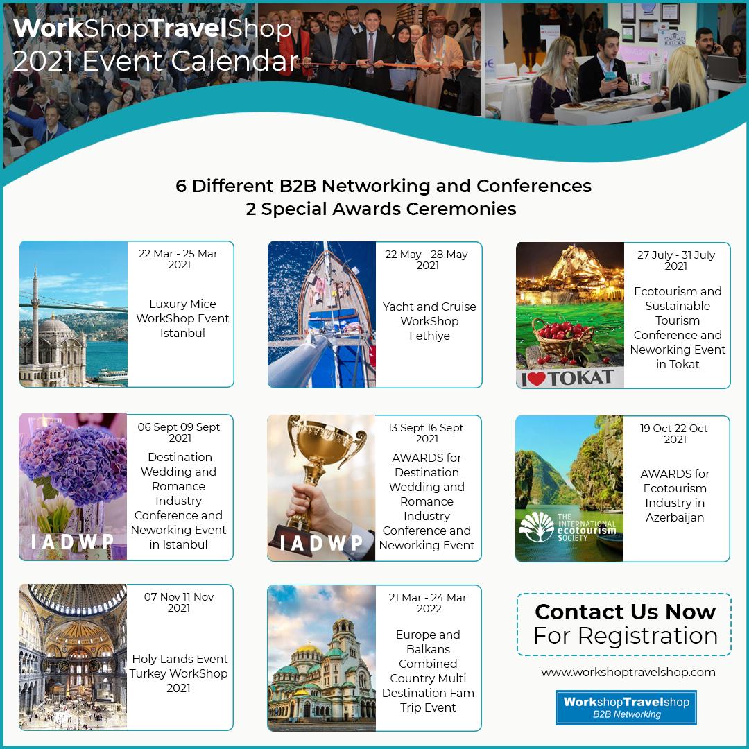 An itibariyle,2021 yılı için 6 ayrı Uluslararası düzeyde Çalıştay ve Konferans etkinlikleri planladık.Ayrıca 2 farklı sektörel temada Ödül Törenleri de düzenleyeceğiz.Bunların başında; Uluslararası Ekoturizm Derneği'nin 16'ıncısını 27 Temmuz’da Tokat'ta düzenleyeceği etkinlik geliyor.Bir diğer önemli etkinlik ise "Uluslararası Düğün Profesyonelleri Derneğinin” 2021 yılı etkinliklerinin bir ayağının da İstanbul’da gerçekleştirilecek olması.