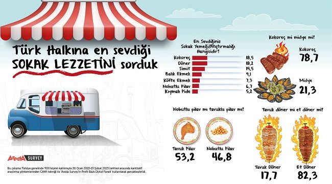Areda Survey tarafından 1100 kişi ile gerçekleştirilen sokak lezzetleri araştırmasına göre Türk halkının en sevdiği sokak lezzeti yüzde 18,5 ile kokoreç oldu. Kokoreci sırasıyla yüzde 18,2 ile döner, yüzde 14,5 ile simit takip etti.