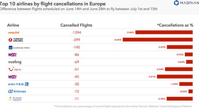 Mabrian 14 Haziran ve 28 Haziran’da 1-15 Temmuz tarihlerinde planlanan uçuş sayılarını karşılaştırdı. Sonuçlar en çok Easyjet ve Türk Hava Yolları’nın etkilendiğini gösteriyor. Easyjet 1.394 uçuşunu iptal ederken THY toplam uçuşlarının yüzde 7 kadarını iptal etti.