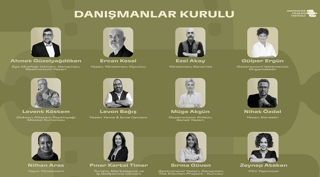 Danışmanlar Kurulu’nda; Ege Mutfağı Uzmanı, Danışman, Gastronomi Yazarı Ahmet Güzelyağdöken, Yazar, Yönetmen, Oyuncu Ercan Kesal, Yönetmen, Senarist Ezel Akay, Gastronomi İşletmecisi, Organizatör Gülper Ergün, Köstem Zeytinyağı Müzesi Kurucusu Dr. Levent Köstem, Yazar, Yeme & İçme Uzmanı Levon Bağış, Gastronomi, Kültür, Sanat Yazarı Müge Akgün, Yazar, Küratör Nihat Özdal, Yayın Yönetmeni Nilhan Aras, Turizm, Markalaşma ve İş Geliştirme Uzmanı Pınar Kartal Timer, Gastronomi Yazarı, Danışman, The Kitchen Project Kurucusu Sırma Güven ve Film Yapımcısı Zeynep Atakan yer alıyor.