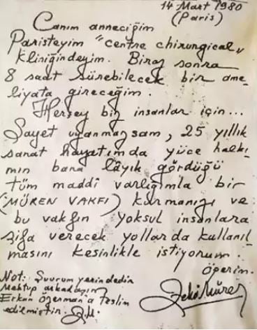 “Canım anneciğim Paristeyim ‘centre chirurgical’ kliniğindeyim. Biraz sonra sekiz saat sürecek bir ameliyata gireceğim. Her şey biz insanlar için. Şayet uyanmazsam, 25 yıllık sanat hayatımda yüce halkımın bana layık gördüğü tüm maddi varlığımla bir (MÜREN VAKFI) kurmanızı ve bu vakfın yoksul insanlara şifa verecek yollarda kullanılmasını kesinlikle istiyorum. Öperim. Not: Şuurum yerindedir. Mektup arkadaşım Erkan Özerman’a teslim edilmiştir.”